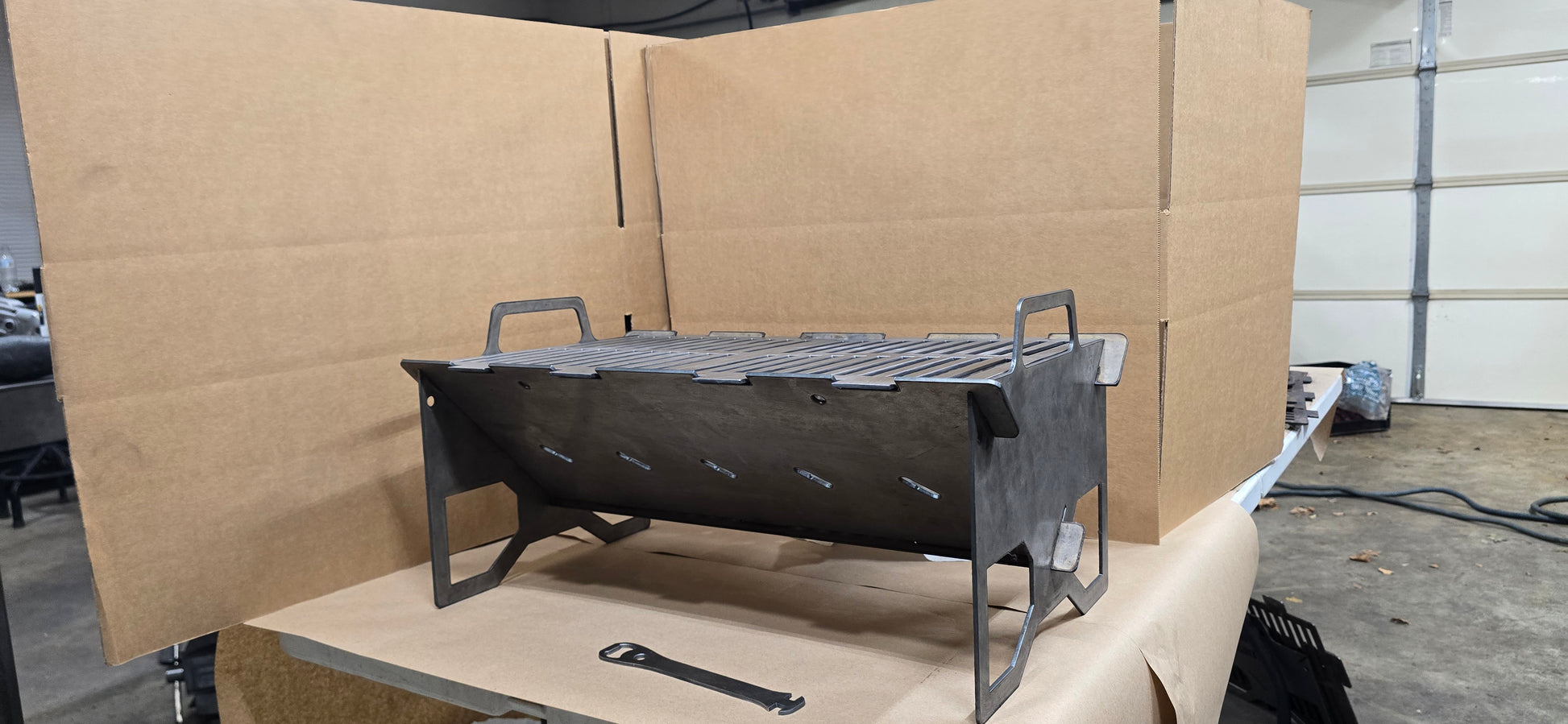 This is the collapsible slot grill. they are 21" long and 12" wide. Cooking surface is 21"x12". The grill grates are split and a lifter key is supplied so can lift 1 panel at a time if you need to adjust your coals. The key also has a bottle opener! You can collapse stack and bolt them together for storage! Cut from 11 gauge carbon steel. This grill comes with slots in side panel for air flow.